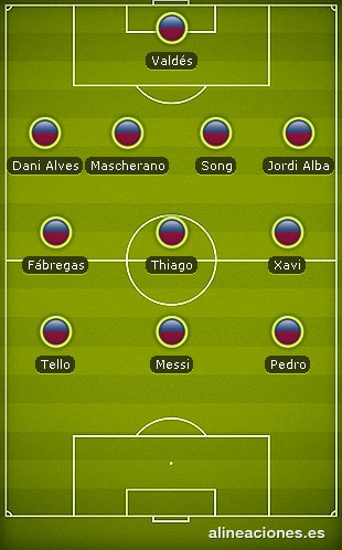 Convocatoria Barcelona: Valdés, Pinto, Alves, Cesc, Xavi, Villa, Alexis, Messi, Thiago, Mascherano, Bartra, Sergio Busquets, Pedro, Jordi Alba, Montoya, Song, Tello y Sergi Roberto.