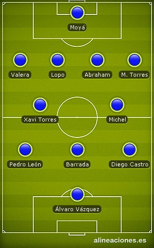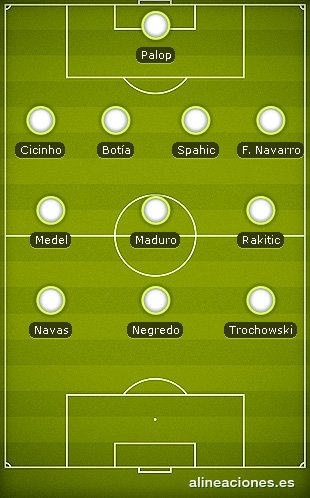 Convocatoria Sevilla: Palop, Diego López, Cicinho, Fazio, Spahic, Fernando Navarro, Botía, Cala, Luna, Maduro, Trochowski, Rakitic, Kondogbia, Hervás, Campaña, Medel, Jesús Navas, Manu del Moral, Baba y Álvaro Negredo.
