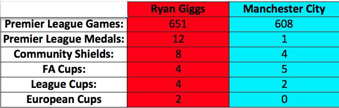Con ello, vemos cómo Ryan Giggs tiene más victorias en partidos y títulos que el Manchester City en toda su historia no sólo en Premier League, sino también en partidos de la Community Shield y títulos europeos. Sólo en la FA Cup el Manchester City supera en un título a Ryan Giggs, ya que el conjunto blue tiene 5 por cuatro del internacional galés.