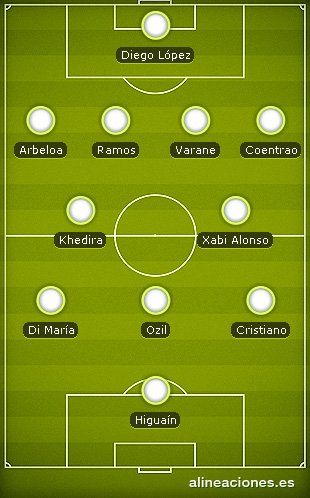 Convocatoria Real Madrid: Iker Casillas, Adán, Diego López, Jesús, Ramos, Arbeloa, Marcelo, Albiol, Varane, Pepe, Coentrão, Carvalho, Modric, Alonso, Khedira, Özil, Kaká, Callejón, Di María, Essien, Cristiano Ronaldo, Benzema, Higuaín y Morata.