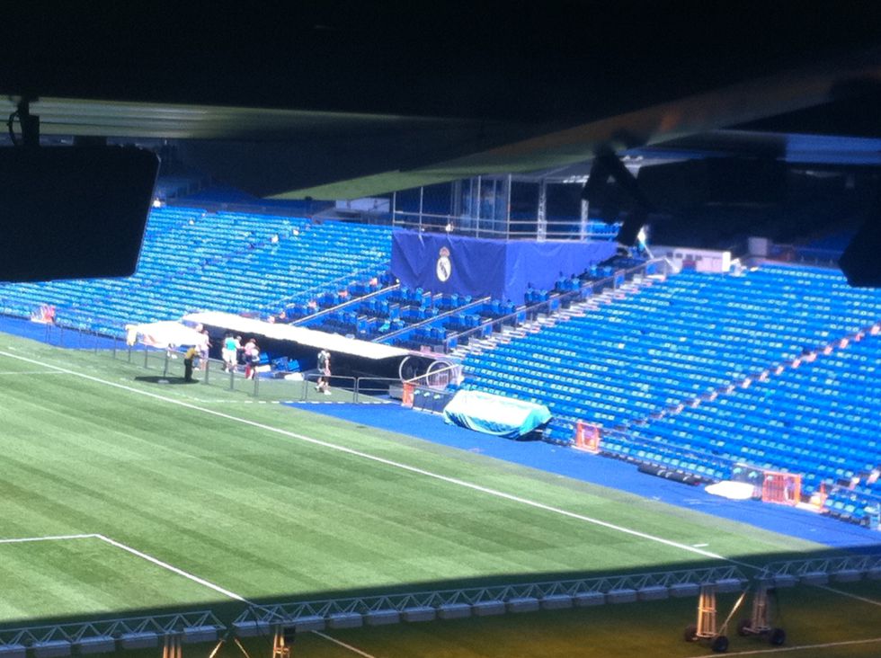 Los operarios del Real Madrid están levantando en la grada un escenario sobre el que Gareth Bale posará junto a Florentino Pérez como nuevo jugador blanco, tal y como se ha hecho en otras grandes ocasiones. Se espera que el acto tenga lugar el sábado. De hecho, AS asegura que se han cancelado varios tours al estadio que estaban previstos para el sábado, por lo que todo apunta a que ese será el día elegido para presentar al atacante galés.