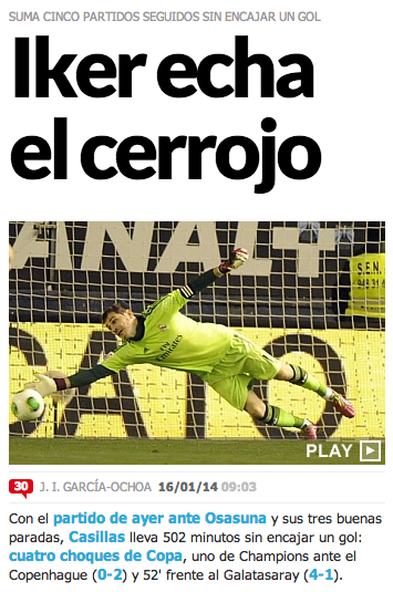 Los números de Iker Casillas mejoran si aumentamos la muestra a sus últimos cinco partidos en la portería del Real Madrid, tal y como ha hecho el diario Marca. A los cuatro partidos sin encajar gol en la Copa del Rey hay que sumar el de Liga de Campeones contra el Copenhague, por lo que Iker Casillas encadena cinco partidos consecutivos sin recibir ni un gol. La última vez que tuvo que recoger un balón del interior de su portería fue en la victoria por 4-1 frente al Galatasaray.