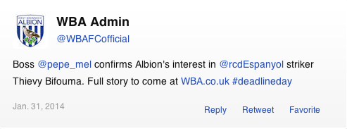 15h48: El West Bromwich Albion confirma que Pepe Mel está interesado en el fichaje de Thiey, del Espanyol.