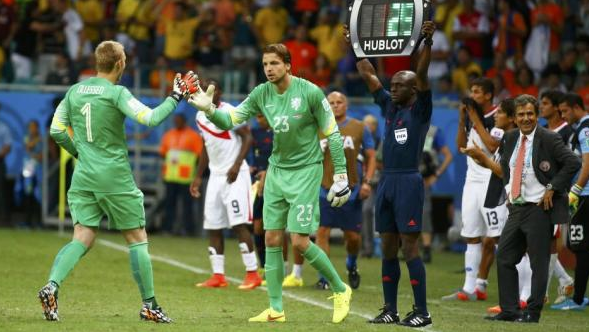 En los cuartos de final entre Holanda y Costa Rica, las tablas se mantuvieron durante los 120 minutos obligando a decidir el pase en la tanda de penaltis. Antes de que terminara el segundo tiempo de la prórroga, el seleccionador holandés decidió cambiar al portero Cillessen por el suplente Tim Krul, que tenía una mayor experiencia atajando lanzamientos desde el punto fatídico. La jugada le salió perfecta ya que Krul paró dos penaltis y Holanda pasó a semifinales.