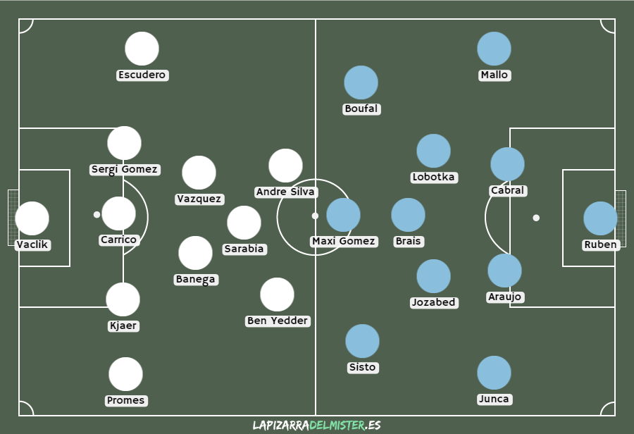 XI del Celta: Rubén Blanco; Hugo Mallo, Gustavo Cabral, Néstor Araujo, David Juncá; Jozabed, Lobotka; Sofiane Boufal, Brais Méndez, Pione Sisto; Maxi Gómez.