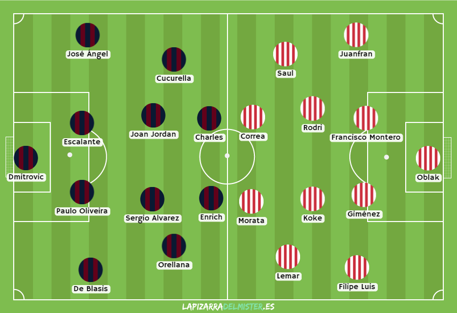 Un duelo de dos equipos que, desde el vamos, tienen propuestas bastante parecidas: Solides defensiva y mecanismos bien marcados en ataque para vulnerar a sus rivales. Tanto los de Mmendilibar como los de Diego Pablo Simeone buscan mantener su arco en cero y, después, comenzar a construir un ataque bastante fuerte. La clave del partido estará en el área de Oblak que, debido a la baja de Godín y la presencia de un central juvenil, tendrá que tener una gran noche ante Sergi Enrich y Charles. Por otro lado, sin sus dos referencias ofensivas, será interesante ver como los colchoneras vulnerarán el bloque defensivo de Mendilibar, uno de los mejores del campeonato.